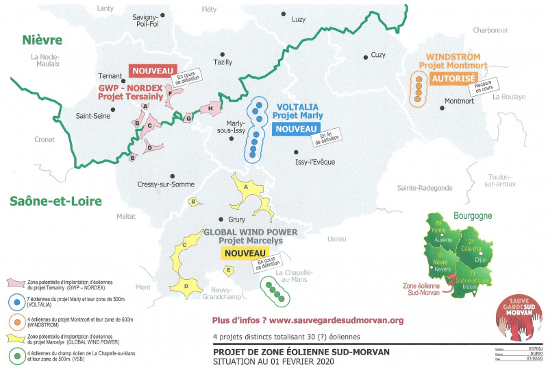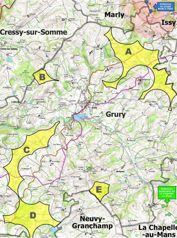 En conséquence, Sauvegarde Sud-Morvan a représenté sur ses cartes, non les éoliennes elles-mêmes, mais temporairement (en jaune) les zones A, B, C, D et E de la commune de Grury dans lesquelles elles pourraient être implantées.